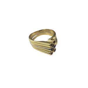 This trendy stacking set features three fixed bands ( 2 yellow gold, 1 white) decorated with six natural sapphires (pink, yellow, blue) and four round brilliant cut diamonds set in 18K yellow gold.