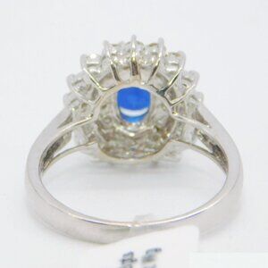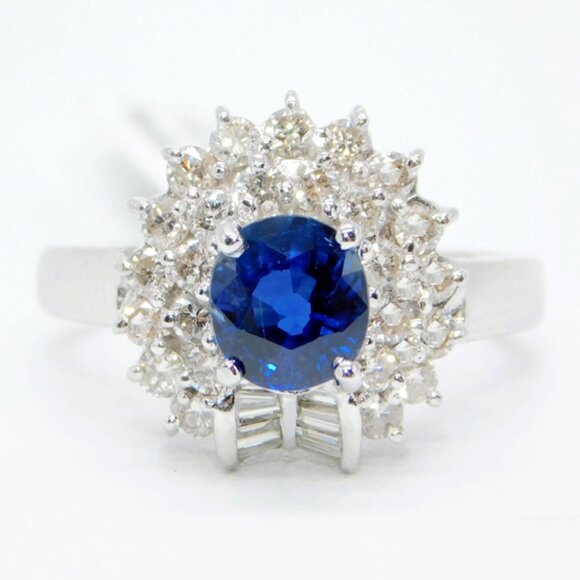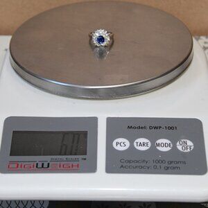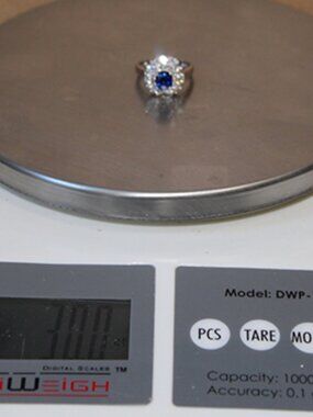 There is 1 oval natural blue sapphire approximately measuring 6.4 mm X 5.8 mm or 1.23 carats.