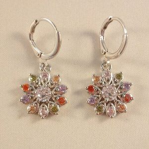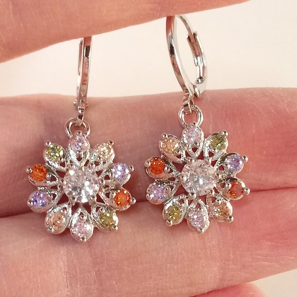 Beautifully crafted classic design flower zircon dangle earrings 18K white gold filled w/sparkling white, morganite, pink, purple, green, and red simulated diamond topaz zircon stones. Fine quality , high polished shine, brand new, never been worn. Lead, nickel free. These earring sparkle.