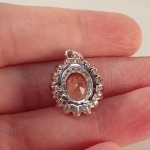 Beautifully crafted classic design morganite zircon flower pendant 18K white gold filled with large sparkling oval shape morganite + smaller round white simulated diamond zircon gemstones. High polished shine, brand new, never been worn. Lead, nickel free. This pendant sparkles.