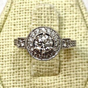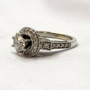 18kt white gold (stamped 18k RE) Diamond Halo Ring w/ pierced scroll filigree design