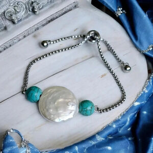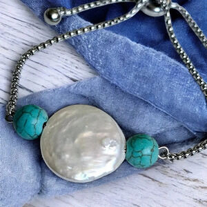 18K white gold plated bracelet, Baroque pearl bracelet, turquoise beads bracelet, adjustable bracelet, stainless steel jewelry, genuine pearl jewelry, trendy bracelet, boho chic bracelet, statement jewelry, luxury bracelet, pearl beaded bracelet, turquoise jewelry, gift for her, minimalist jewelry, fashion accessories, stacking bracelet, dainty bracelet, bohemian style, elegant bracelet, unique jewelry, summer jewelry, everyday bracelet, wrist jewelry, adjustable slider clasp, women's jewelry, gemstone bracelet, dainty