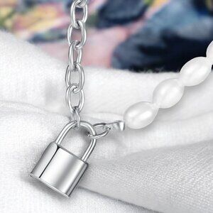 🆕18K White Gold Plated Chain Necklace with Padlock Charm & Freshwater Pearls