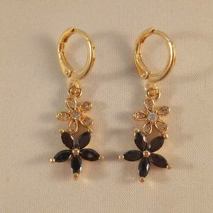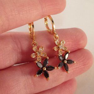 Beautiful crafted classic design layered flower zircon dangle earrings 18k yellow gold filled w/sparkling marquise shape black onyx + small round clear white simulated diamond topaz zircon gemstones. Top quality, high polished shine, brand new, never been worn. Lead, nickel free. These earrings sparkle.