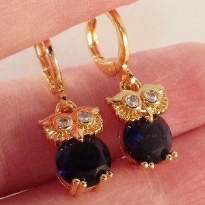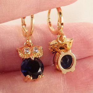 Beautiful crafted women's classic design blue sapphire zircon owl dangle earrings 18K yellow gold filled w/sparkling large round blue sapphire + white simulated diamond topaz zircon gemstones. Polished shine, brand new, never been worn. Lead, nickel free. These earrings sparkle.