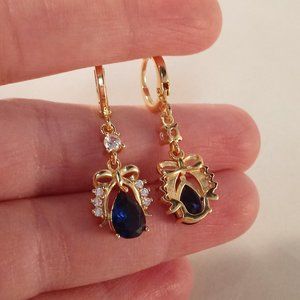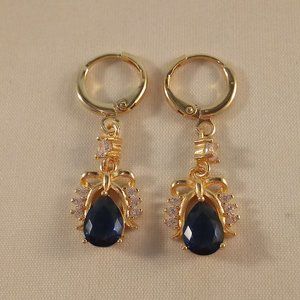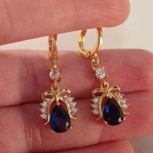Beautifully crafted women's classic design bow knot dangle earrings 18K yellow gold filled with large sparkling mystic navy blue pear + round white simulated diamond topaz zircon gemstones.Top quality, high polish shine, brand new, never been worn. Lead, nickel free. These earrings sparkle.