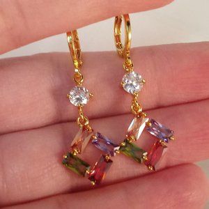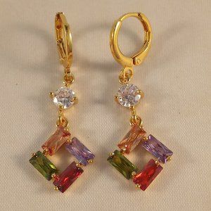 Beautifully crafted women's classic hollow rhombus square diamond zircon dangle earrings 18K yellow gold filled with sparkling baguette + round simulated diamond topaz zircon gemstones. Brand new, never been worn. Lead, nickel free. These earrings sparkle.