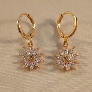 Beautiful crafted women's classic design sunflower zircon dangle earrings 18K yellow gold filled w/sparkling marquise shape clear white simulated diamond topaz zircon gemstones. Top quality, high polished shine, brand new, never been worn. Lead, nickel free. These earrings sparkle.