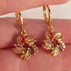 Beautifully crafted women's classic elegant design hollow flower carved leaf swirl pinwheel zircon dangle earrings 18K yellow gold filled with sparkling marquise shape red peridot olive green pink purple + morganite simulated diamond topaz zircon gemstones. Top quality, high polished shine, brand new, never been worn. Lead, nickel free. These earrings sparkle.