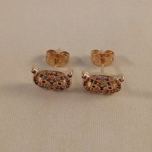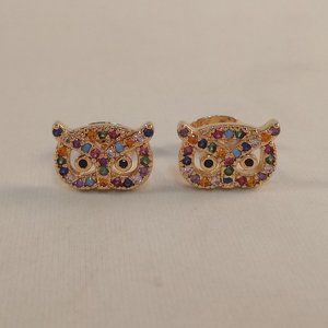 Beautiful unique detailed design festive hollow small multi color zircon owl stud earrings 18k yellow gold filled w/sparkling small round multi color simulated diamond topaz zircon gemstones. Top quality, high polished shine, brand new, never been worn. Lead, nickel free. These earrings sparkle.