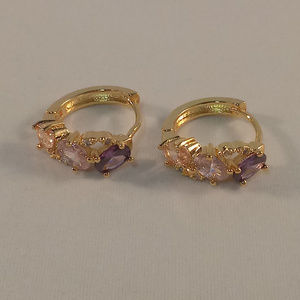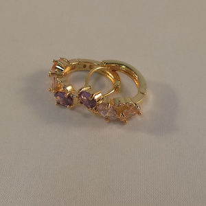 Beautifully crafted classic design infinity swirl zircon hoop earrings 18K yellow gold filled w/oval pink, morganite and purple + smaller white simulated diamond topaz zircon gemstones. High polished shine, brand new, never been worn. Lead and nickel free. These earrings sparkle.