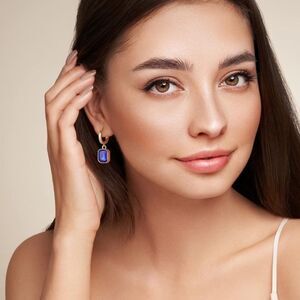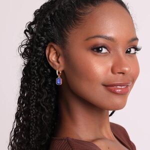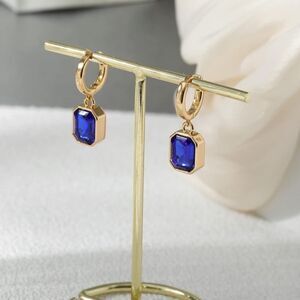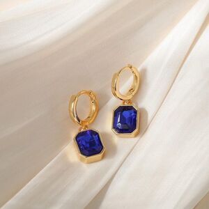 18K Yellow Gold with Blue Sapphire Crystal Dangling Octagon Huggie Earrings