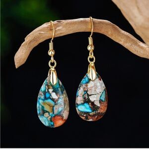 18k Pure Yellow Gold Hook Dangling Drop French Wire Hook Water Drop Earrings with Unique Imperial Blue Orange Jasper Natural Stones