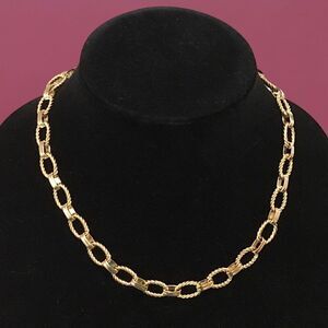 This Beautiful 18k gold tone plated chain with an interlocking silhouette make a sophisticated statement on this vintage polished goldtone necklace.
