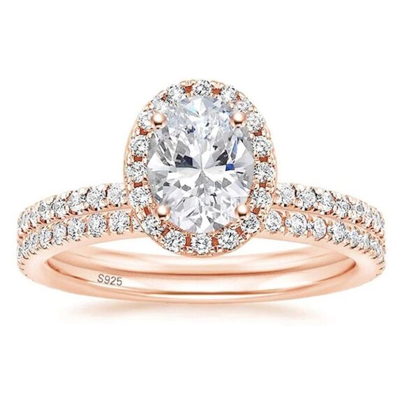 Brand New - 18k RGP S925 Sterling Silver with Round Cut Cubic Zirconia and 1.5 ct. Oval Cut Halo White Diamond Cubic Zirconia Engagement and Wedding Bridal Rings