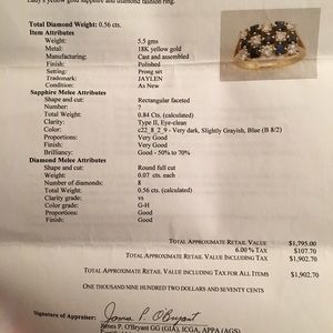 8 diamonds and 7 sapphires. Excellent condition. Appraisal paperwork is included