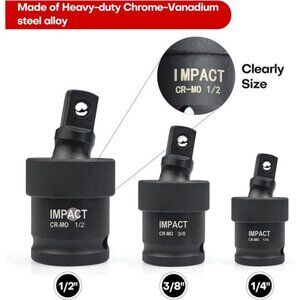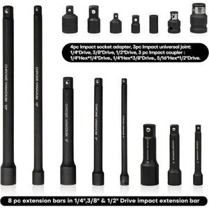 🧿【Package Include】:The imapct extension socket set ncludes 8 pc extension bars in 1/4",3/8" & 1/2" Drive impact extension bar, 4pc Impact socket adapter, 3pc Impact universal joint: 1/4"Drive, 3/8"Drive, 1/2"Drive, 3 pc Impact coupler :1/4"Hex*1/4"Drive., 1/4"Hex*3/8"Drive., 5/16"Hex*1/2"Drive.