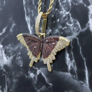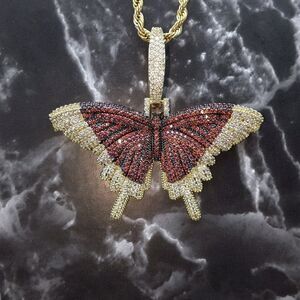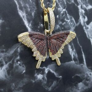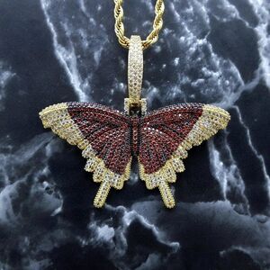 New Icy 14K Gold Finish Red CZ Butterfly Pendant + 14K Gold Finish 18" x 3mm Rope Chain over Stainless Steel for Men & Woman.