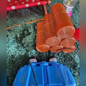Miniature deck chair with red polka dot fabric. Includes blue binoculars, pink lantern, and brown log accessory.