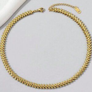 16 inches Sleek and stylish, this gold choker features a bold chevron design that hugs the neckline perfectly. Lightweight and elegant—ideal for layering or wearing solo for a chic, modern look.