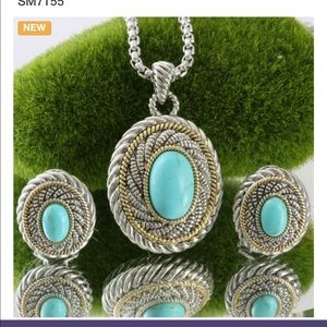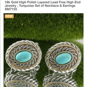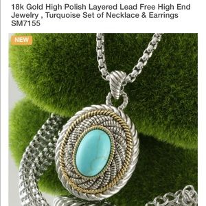 This Stunning Set of Necklace & Earrings is crafted in Fine 18k Gold High Polish Layered Lead Free that is Lead Free, Nickel Free, Allergy Free. The Set contains 4.95ctw Man-made Turquoise. Total weight for this Set is 27.3 grams. The Earrings measure 3/4" long. The pendant measures 1 3/4 inches long. The chain is 16 inches long.