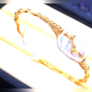 A copper and one of a kind baroque freshwater pearl bracelet is believed to offer physical benefits such as potential pain and inflammation relief from copper and skin health support from pearls, alongside emotional benefits like stress reduction and inner wisdom from pearls and energetic balance from copper.