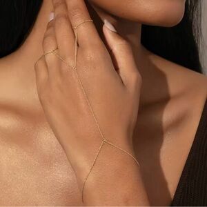 This elegant gold hand chain bracelet adds a touch of sophistication to any outfit. Perfect for any occasion.