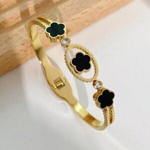 18k Gold Plated Stainless Steel Black Clover Bangle, Zircon Inlay, Hinge Opening