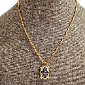 The double-sided pendant allows you to switch up your look effortlessly, suiting different outfits and occasions. On one side, you will find a beautifully detailed cubic zirconia dark blue hamsa featuring a green and gold border. On the other side, a stunning gold version of the hamsa is adorned with tiny cubic zirconia accents, adding a subtle sparkle.