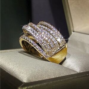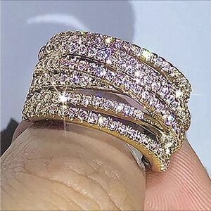 • Design: Wide band with layered pave-set cubic zirconia rows across the top, featuring a soft crossover motif.