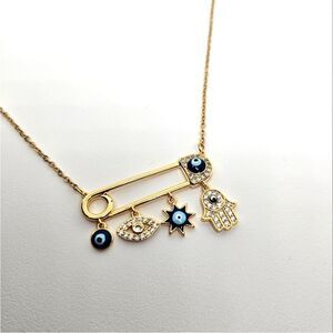 18k Gold Boho Evil Eye Safety Pin Pendant Necklace