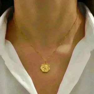 This elegant necklace features a detailed floral pendant, crafted in gold-filled metal, suspended from a delicate beaded chain. A timeless piece that adds a touch of nature-inspired beauty and sophistication to any outfit.