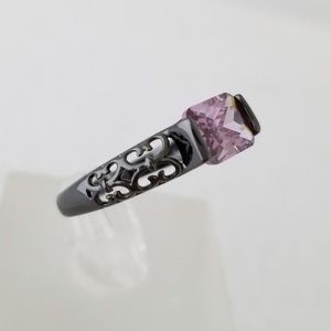 Ring is 18k plated black gold with a beautiful horizontal simulated amethyst and filigree work on the sides. See pictures for details, lovely design.
