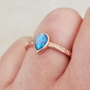 This is a 7mmx5mm teardrop simulated blue opal cabochon set on sterling silver with 18k rose gold over it. The colors inside are gorgeous and the extra detail on the metal work gives it a more upscale look. Very delicate and elegant, see pictures for details.