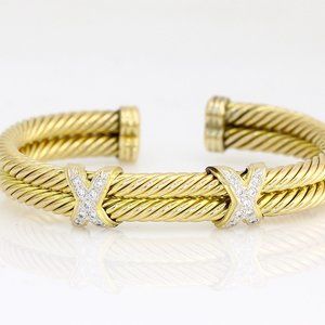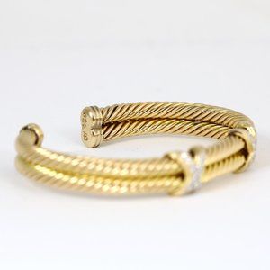 18 karat yellow gold double cable oval cuff bracelet featuring two pavé diamond X's with 36 diamonds total. Approximately 0.75 carats of diamonds at F color, VS clarity. Diamonds are set in white gold. Inside diameter measures approximately 7 centimeters across and 5 centimeters tall. Total weight of the cuff is 22.4 grams.