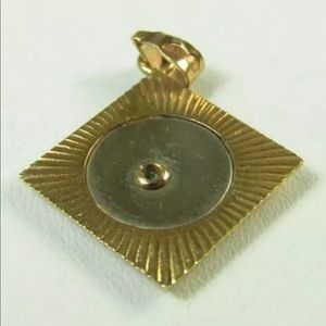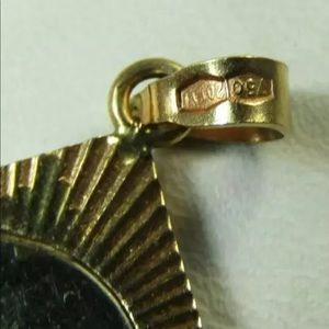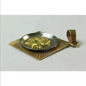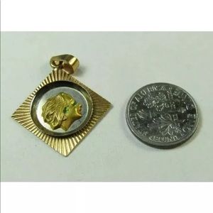 750 Marked, 18K tested Yellow and White Gold, Vintage Pendant - relief of the Woman in a Blindfold - most likely Goddess of Justice - Justitia or Themis, with simple sun ray looking Texture on the frame.
