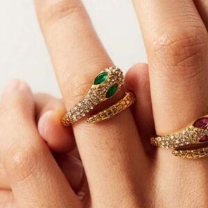 This stunning gold snake ring features vibrant green accents, perfect for adding a touch of elegance to any outfit.