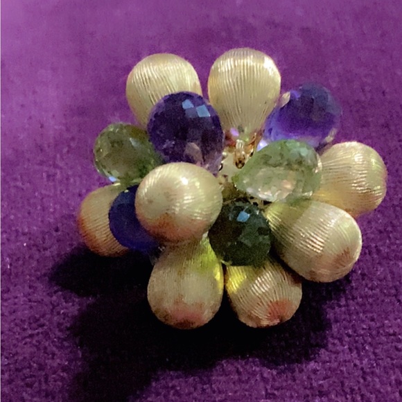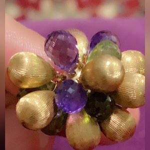 Elegant and unique 18k solid yellow gold ring. It features 8 Brushed solid gold accents accompanied by Briolette cut purple and green. There are 4 faceted briolette amethyst and 4 briolette period. The ring is size 6 and weighs 9.7 grams. It is acid tested and stamped 750 Italy.
