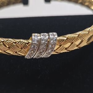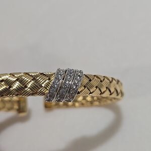 This stunning Italian bracelet features a woven design of 18k gold plated bronze base metal with a sparkling silver accent with crystals.