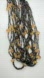 I think I counted 10 strands total. All gunmetal toned glass seed beads with faceted orange/champagne colored accent crystals!