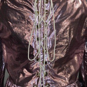 18th Century style gown. Marie Antoinette fantasy court gown in mauve lame’. Period cut and style, just not the fabric and skirt is attached. Mauve lame’ dress white lace trimmed bodice with burgundy satin ribbon faux stomacher design. White lace trimmed attached skirt front with burgundy satin trim. Wide white lace at the bottom edge of sleeves. Lace up back with a 1.5" placket. Attached burgundy satin under skirt with scalloped white lace front and lace hem. Snaps at hem on each side where over skirt attaches. One small tear at side seam underskirt. White padded panniers and white hoop with ruffles to hide hoop lines (has some spots on lace due to touching the floor, one casing needs restitched (functional. easily repaired). Use padded panniers only for a more 18th Century look. Or use the hoop for a Princess effect. Shown with hoop in main picture. Additional picture shows with panniers only. White feather headpiece. Color shade depends on the lighting and whether it is steamed. But it's mauve. Size 16. Bust 38"-40", Waist 34", Length from shoulder 62". 1" give in measurements because of the placket.