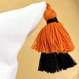 The embroidered detail of dancing skeletons holding Jack O' Lanterns is fabulous! The pillow cover is white with black embroidered skeletons and orange and black embroidered Jack O' Lanterns. There are double orange and black tassels on each corner. The tassels measure approx. 2 1/2" long. These definitely add to the fun vibe of these Halloween pillow covers! These pillow covers are constructed with quality material and they are a durable weight, sure to last many Halloweens.