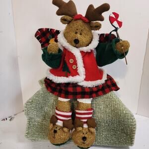 Celebrate the holidays with this charming 19" angel reindeer plush shelf sitter doll! She wears a red and plaid holiday outfit with angel wings, reindeer slippers, striped socks, and holds a peppermint candy cane wand.