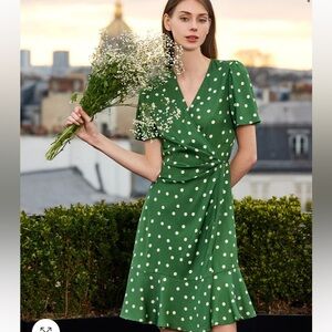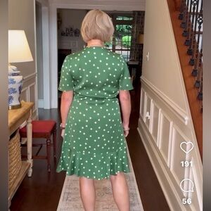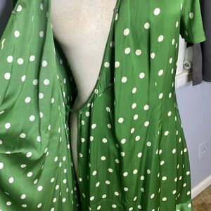 Mulberry silk wrap dress and cream dots on beautiful green fishtail wrap dress with tie waist