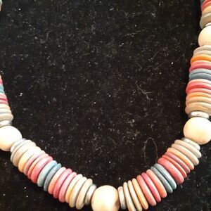19" multicolored wood disk necklace with neutral round wood beads. Brings a touch of color to beige, taupe, brown. Natural beauty.
