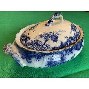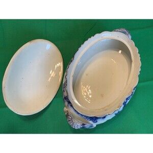 This Klondyke MS&CE serving dish is a vintage oval covered dish, perfect for decorative cookware or dinnerware. The dish features a beautiful blue color, and is made of porcelain and bone china materials. Although the rim of this dish is slightly chipped, it does not affect the functionality of this piece. This dish is great for serving your favorite dishes and adding a touch of elegance to your table setting.