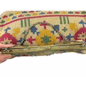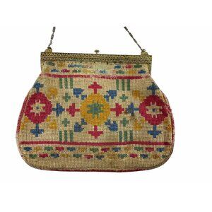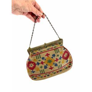 Amazing 1920s needlepoint handbag with a fantastic arts deco design! Beautiful carved brass frame and filigree chain handle. I love the swan anchors for the handle on each side of the frame! Push button clasp. Interior is lined with moire silk and and has a zippered pocket as well as two open pockets, one large and one small. No makers labels present. Condition is as expected for this age. There is wear on the exterior near the top under the frame. There is some light soiling and two darker spots. The yarn is wool. The interior shows shredding of the silk but pockets are intact and zipper works. It’s a large bag which is unusual for this era and it will hold your cell phone and other essentials without and problem.