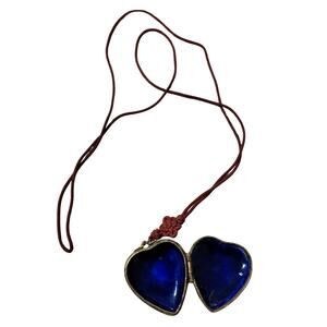 1900s Antique Cloisonne Enamel Red Floral Heart Trinket Locket Pendant Necklace on a Red Cord. From the early 1900s. Sold with and affixed to the original red cord (It's a rare find. Many are sold missing the original cord). Blue enamel painted on the interior.