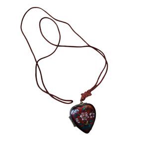 1900s Cloisonne Enamel Red Floral Heart Trinket Locket Pendant Necklace Red Cord