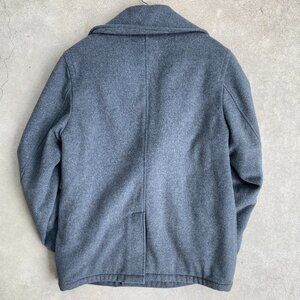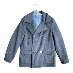 1901 dark gray long pea coat. Features: collar, pockets on either side, red and black plaid neck pattern detail underneath, lined, large silver button hardware that have engraved anchors. First photo is for style inspirational purposes only.